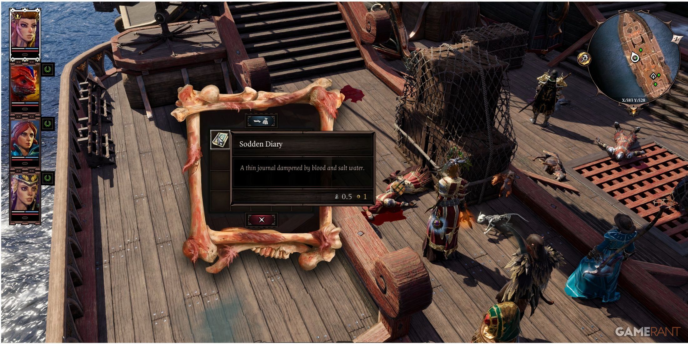 Begin by searching the bodies of the magisters and gheists on deck. A dead magister holds a Sodden Diary containing a password. You can also obtain the password by passing a skill check at the northern stateroom door. You'll also need a Strange Gem to interact with the Portside Stateroom door. A magic mirror (south of the stateroom doors) allows respeccing characters, useful for skill checks.